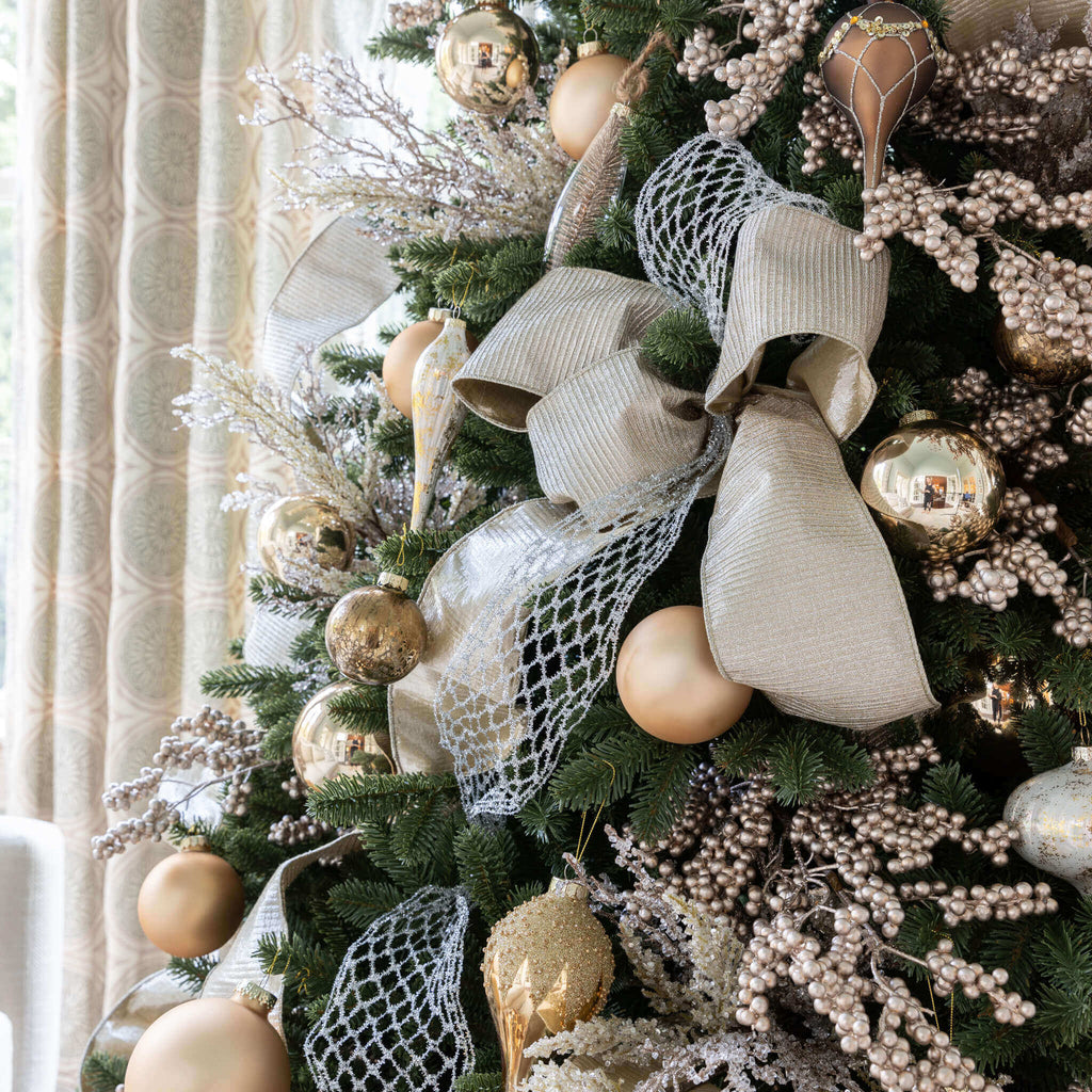 - Decorações em champanhe (como bolas, guirlandas e fitas), que evocam o brilho das celebrações.