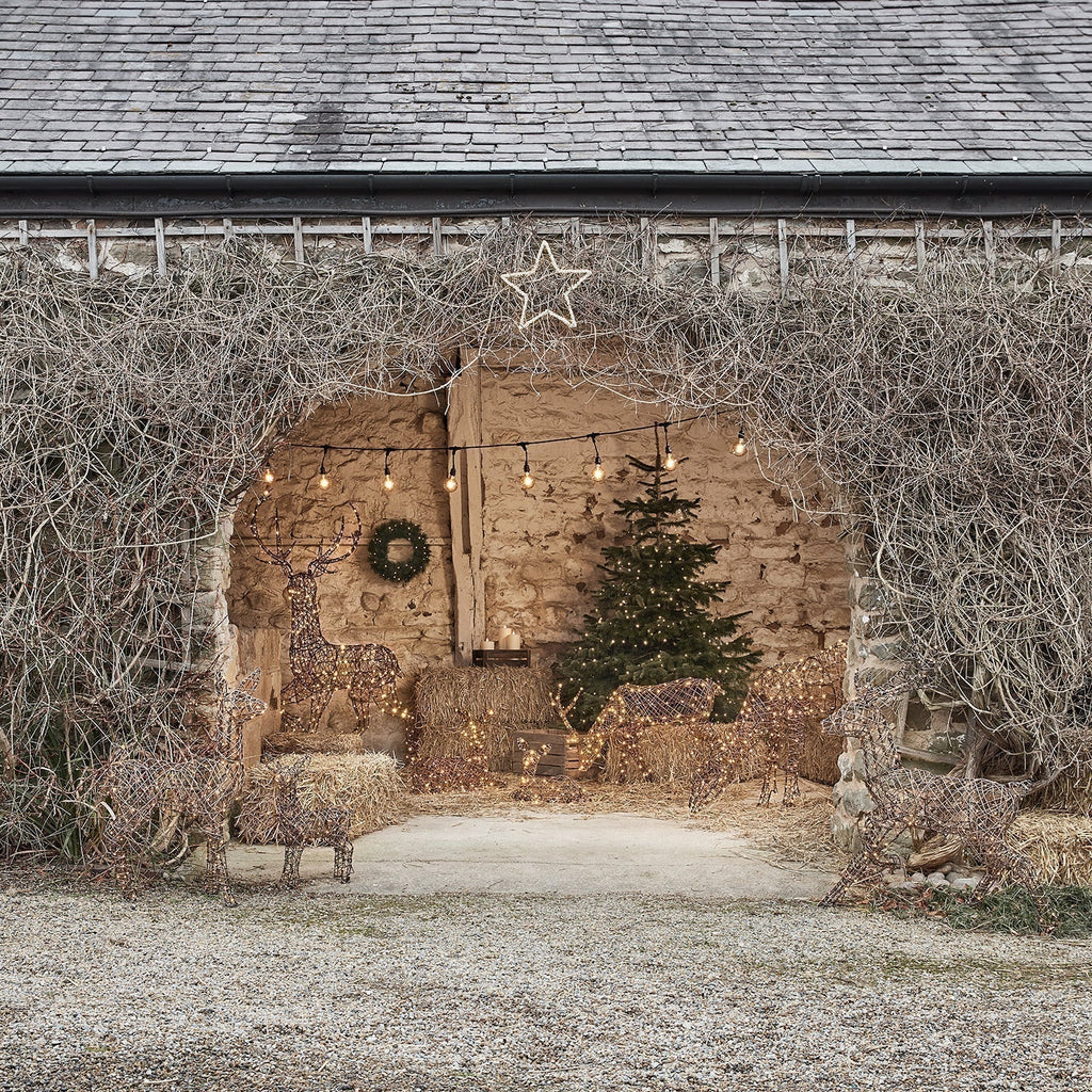 Com estruturas de metal feitas à mão e envolto em um falso rattan marrom à prova d'água, estas figuras festivas ganham vida com LEDs em tom branco quente cuidadosamente posicionados, proporcionando um brilho impressionante ao anoitecer.