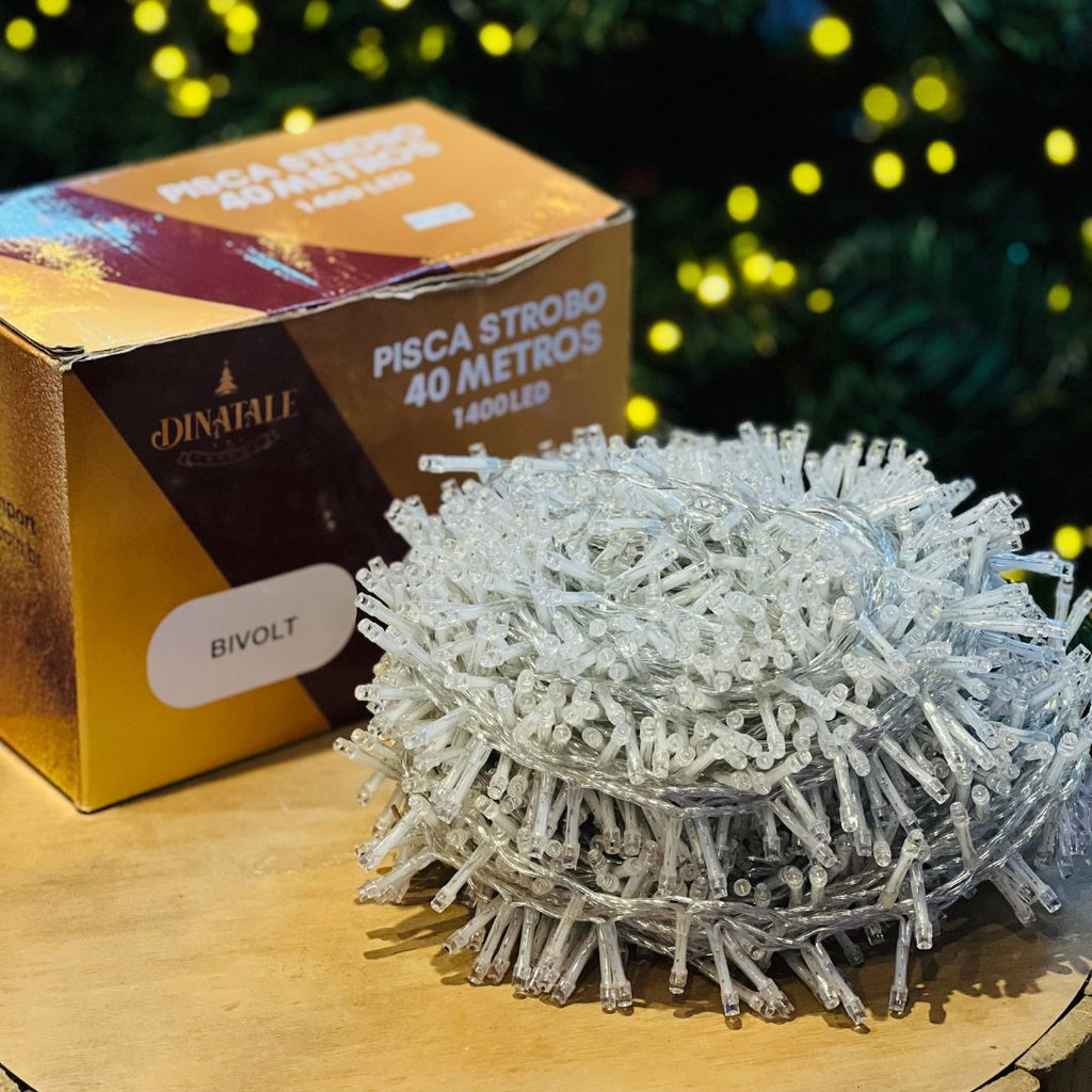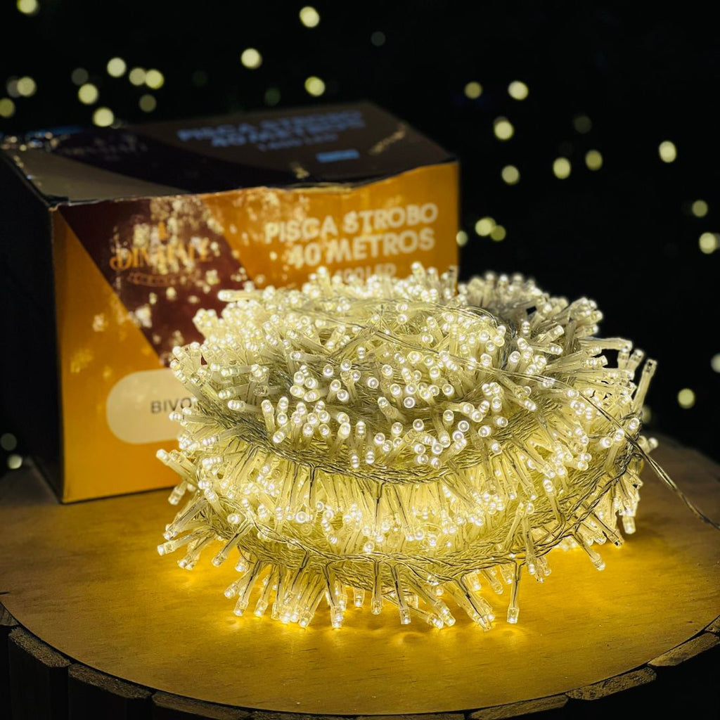 O Pisca Estrobo de 40 metros é perfeito para iluminar ambientes com um efeito festivo e moderno, ideal para decorar fachadas, árvores, varandas, vitrines ou qualquer espaço que precise de um toque especial em datas comemorativas. Com 1400 LEDs distribuídos ao longo do fio transparente, proporciona uma iluminação intensa e uniforme na tonalidade branco quente, criando um ambiente aconchegante e acolhedor. A função estrobo permite diferentes modos de piscar, trazendo dinamismo à decoração. Produto bivolt, pode ser conectado diretamente à tomada, oferecendo praticidade e versatilidade no uso.